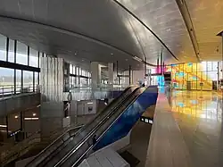The design team for the station was AECOM as the prime consultant, Aedas as design architect, and Parsons Brinckerhoff as design engineers.[3] The station is an intermodal transit facility providing connections to York Region Transit (YRT), GO Transit buses, and Ontario Northland intercity coaches. It will also connect to a future Highway 407 Transitway.[4] The station has a 550-space commuter parking lot[5] and a large 18-bay regional bus terminal. This station has been engineered and positioned for the construction of underground bus platforms for the proposed Highway 407 Transitway.[6] The station has an open design, particularly to the east overlooking the Black Creek. Due to structural elements related to the water table, the centre platform has no columns, with all weight being transferred to the sides to counter buoyancy.[6] The station has a metal cool roof to reflect heat from the sun.[7]