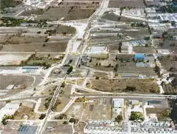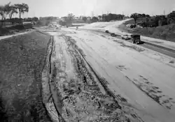 Construction of the Toronto Bypass began near Yonge Street in 1949 (along present-day Highway 401) and on the four-laning of Highway 27 in 1953.[11][12] The Highway 27 work involved the construction of two interchanges: a three-way interchange at Highway 401 and a large cloverleaf at the QEW, the latter of which would become one of the worst bottlenecks in the province a decade after its completion, according to Minister of Transportation Charles MacNaughton.[13] By September 1956, it was possible to bypass Toronto entirely on the four lane divided highway composed of Highway 401 and Highway 27.[14][15] Highway 401 was extended to the west soon after,[16] but Highway 27 remained a two-lane highway north of it.[17]