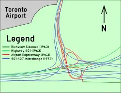 During the early 1960s, Toronto International Airport was expanded with the construction of the Aeroquay One terminal.[18] To serve the expected demand of the airport expansion, the DHO built a new four-lane freeway known as the Toronto Airport Expressway which opened on January 3, 1964. This new route ran north from Highway 401 at Renforth Drive to Dixon/Airport Roads (roughly followed the same alignment as today's Highway 427) where it tied in with and downgraded into Indian Line. The Airport Expressway featured a connection with the western terminus of Richview Sideroad at the southern end of the interchange with Highway 401 as well as an interchange with Renforth Drive.[19] On Highway 401 the Airport Expressway interchange was located 1 km (0.62 mi) to the west on the existing interchange with Highway 27.[20][19][21]