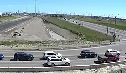 Highway 401's new junction with Highway 27 remains the largest interchange in Canada as it sprawls over 156 ha (385 acres) and required the construction of 28 bridges and the equivalent of 46.6 km (29 mi) of two-lane roadway, being built around the existing Richview Memorial Cemetery. On Highway 401 this required the removal of the existing interchange with Highway 27 as well as the half-cloverleaf interchange with the Airport Expressway which was 1 km (0.62 mi) to the west as both were originally conceived as separate routes. These two separate interchanges were replaced with a single large junction, where north of Highway 401 the collector lanes would continue the Highway 27 routing while the express lanes would shift westward to meet the rebuilt Airport Expressway. The reconstructed interchange also including connections to Eglinton Avenue (ultimately meant for the proposed but never-built municipal Richview Expressway) from all directions except for Highway 401 east of that interchange, while Carlingview Drive received ramps to Highway 401 east of that interchange.[28] While the new interchange with the QEW was opened to traffic on November 14, 1969,[29] the more complex Highway 401 junction required several more years of construction staging, fully opening on December 4, 1971 (though portions were opened in the weeks prior to that). On that same date, Highway 427 was inaugurated as it assumed the collector-express portion of Highway 27 and the new Airport Expressway. North of Highway 401, while the existing Highway 27 remained a provincial route as it transitioned from an expressway to an arterial road, the parallel section of Highway 427 effectively served as a freeway bypass.