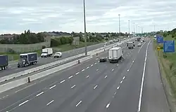In 1963, MacNaughton announced that Highway 401 would be widened from a four-lane highway to a collector-express system, modeled after the Dan Ryan Expressway in Chicago.[15] Plans were soon developed to apply this model to the QEW between Highway 27 and Royal York Road and to Highway 27 between the QEW and Highway 401, and were unveiled to Etobicoke council on October 13, 1966.[22] Design work followed and was completed by May 1967.[23] The widening of Highway 27 required the demolition and rebuilding of overpasses at Bloor Street, Burnhamthorpe Road, and Rathburn Road constructed just over a decade earlier.[23] The rest of the route was rebuilt by September 1968, the next stage involved the reconstruction of the interchanges with QEW and Highway 401 which were reconfigured into complicated multi-level interchanges to permit free-flow movement.[24][1][25]