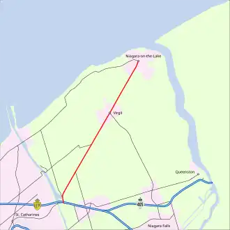 Highway 55 passed through the small town of Virgil, which is centred on the Four Mile Creek. It intersected Four Mile Creek Road (Niagara Regional Road 100) in the centre of the town, then entered back into an agricultural area. Shortly thereafter, the highway entered the urban area of Niagara-on-the-Lake, where it ended at Mary Street (Niagara Regional Road 87).[5]