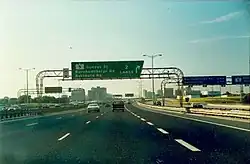As suburbanization of Toronto encroached on Toronto Township—which would become the town of Mississauga in 1968—the DHO began to widen Highway 5 to four lanes across Peel and Halton in the 1960s, beginning with the section between Highway 10 at Cooksville and Mississauga Road in 1961.[30][31] In the late 1970s, construction began on Highway 403 through Mississauga. As part of this new freeway, an interchange with Highway 5 was built just east of Ninth Line, on the Oakville–Mississauga boundary. The interchange opened along with the segment of Highway 403 south to the Queen Elizabeth Way at Ford Drive in mid-1981; the freeway was extended north to Erin Mills Parkway on November 17th of that year.[32][33]