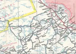 Several changes occurred in the Round Lake area through the 1950s and 1960s. In 1956, Highway 521 was designated by the DHO between Brudenell and the northern segment of Highway 62 at Bonnechere Provincial Park.[18][19][20] Four years later, Highway 62 was extended concurrently along Highway 60 between Barry's Bay and Killaloe and north along Highway 521 to Tramore on the southeast side of Round Lake.[21][22] The remainder of Highway 521, between Tramore and Bonnechere Provincial Park, was renumbered Highway 62 in 1967, reuniting the two sections of the route.[23][24]