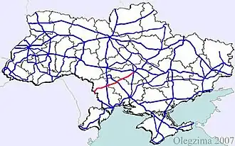 M13 is a Ukrainian international highway (M-highway) connecting Kropyvnytskyi to the border with Moldova, where before crossing the Dniester it heads towards Chişinău as the M1.[1][2] The entire route is part of European route E584.