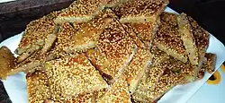 In Palestinian cuisine, Hilbeh, Hulbah, or Fenugreek Cake (Arabic: حلبة) is a dessert made from fenugreek seeds, olive oil, and semolina, topped with nuts, nigella seeds, or sesame, then coated in sugar syrup, which soaks into the cake.[1]