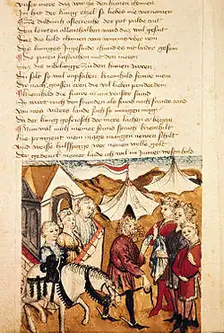 The Scandinavian song "Hildebrand's death" tells how Hildebrand fights against his half-brother. He is wounded fatally by him and the shield with the picture of his son falls near to his head on the ground. He begs his half-brother to cover his body, and to bury him properly.