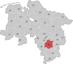 Hildesheim is located in southern Lower Saxony. As of the 2021 federal election, it comprises the district of Hildesheim.[1]
