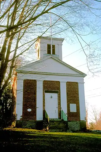 The academy building occupies a prominent location overlooking Essex's Main Street area, facing east on the west side of Prospect Street just south of the Congregational and Baptist churches. It is a two-story brick building, with a gabled roof capped by a squat single-stage belfry. The front facade is three bays wide, articulated by brick pilasters painted white, which rise to an entablature and fully pedimented gable. Pilasters are also found at the corners of the wood-framed belfry, which has rectangular louvered openings. The main entrance is in the central bay, while the flanking bays are blank. The interior has an entrance vestibule, from which narrow stairs wind to the second floor on the right. Each floor has a single large chamber, which functioned as classrooms during the building's academy phase. Original finishes include wood flooring and staircase trim.[2]