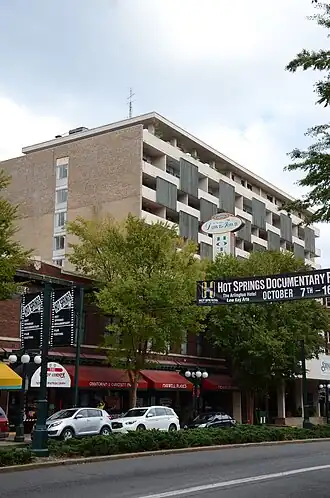 The Hill Wheatley Downtowner Motor Inn is a historic hotel at 135 Central Avenue in Hot Springs, Arkansas, United States. It is a ten-story rectangular structure, finished in glass, brick, and metal, in the Mid-Century Modern style. Its main block is set back from the street, behind a two-story entry retail section. The tower is fronted mainly by balconies with panels of redwood screening to provide visual relief and shade. The hotel was designed in 1965 by Noland Blass Jr. of Erhart, Eichenbaum, Rauch & Blass for Hill Wheatley, one of Hot Springs' major promoters. It is one of the only surviving hotels in the city with its own bathhouse.[2]