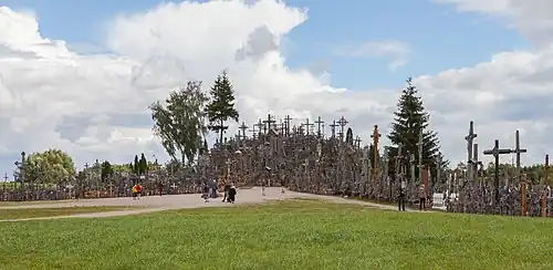 Hill of Crosses (Lithuanian: Kryžių kalnas) is a site of pilgrimage about 12 km north of the city of Šiauliai, in northern Lithuania. The precise origin of the practice of leaving crosses on the hill is uncertain, but it is believed that the first crosses were placed on the former Jurgaičiai or Domantai hill fort after the 1831 Uprising.[2] Over the generations, not only crosses and crucifixes, but statues of the Virgin Mary, carvings of Lithuanian patriots and thousands of tiny effigies and rosaries have been brought here by Catholic pilgrims. The exact number of crosses is unknown, but estimates put it at about 55,000 in 1990[3] and 100,000 in 2006.[4] It is a major site of Catholic pilgrimage in Lithuania.
