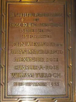 A plaque at the entrance to the church, erected in 1933, commemorates the founding role of five parishioners in 1883: The inscription reads:
