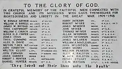 At the outset of war, 120 male members of the congregation volunteered for military service, including most of the church's Sunday School teachers.[29] As one example of losses early in the war, a church member who attended Fettes College, in Edinburgh, died at the Battle of Neuve Chappele in 1915.[30] In 1916, Hillhead minister Dr John MacBeath noted the war had ‘made faith difficult’ and would herald significant political change.[31] By the end of the war, Hillhead had lost fifty-five members from its congregation, the highest losses among Baptist churches in Scotland. [32]