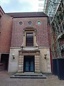 Derbyshire's design envisaged a diamond-shaped building to the west containing the offices of the council officers and their departments and a more irregular-shaped building to the east containing the public areas including the council chamber, the civic suite and register office.[8] The main frontage to the public areas, facing onto the High Street, featured a loggia with eight entrances and a steep roof, with a two-storey block with a clock tower behind.[1] The design made extensive use of brick and tile, to pay homage to traditional homely brick architecture of nearby buildings and suburban developments that were "indigenous to the borough".[15][16] It was designated a Grade II Listed Building in April 2018.[1]
