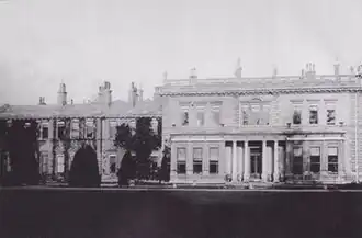 Sir Charles Mills, partner in the London bank of Glyn, Mills & Co., bought two houses in rural Vine Lane in 1825, following his marriage to Emily Cox, daughter of the banker Richard Henry Cox. The Coxs had a house in Hillingdon.[2] Mills had both houses demolished and the sites combined to allow for the construction of a new mansion. Designed by Philip Charles Hardwick, the mansion was built of white brick and stone between 1854 and 1858.[1] Mills and ten members of his family lived there, with 33 servants.[3]