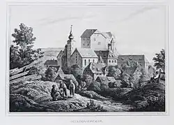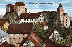 The new Landgerichte replaced the former Pflegämter and the pfleger castle of Hiltpoltstein was vacated at the end of 1807 as an administrative office. The castle and mansion were initially sold to a local master bricklayer (Maurermeister); later, it was acquired by the publican, Georg Schmidt. As a result of a lack of investment, the castle meanwhile became completely derelict; even entire roofs were missing. In 1841 the dreadfully neglected castle was depicted in the Korrespondent von und für Deutschland as ripe for demolition, something that was only prevented by the personal intervention of King Ludwig.[27] After its return to royal Bavarian ownership in 1843 it was repaired at the expense of the state and then became the head office of the local forestry commission. In the second half of the 19th century Hiltpoltstein benefited from the rise in "castle romanticism" and received many foreign visitors, something that is recorded in a castle guest book running without a break from 1843 to 1965 and which is now in private hands in Hiltpoltstein.[28]