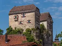 In the courtyard, which opens to the north, are the foundations of the octagonal bergfried with a diameter of roughly 9.30 metres. This partially collapsed in 1611 when it was hit by lightning and was then reduced to the height of the first floor together with its link to the east wing. The remaining, initially single-storey stump of the bergfried is recorded in a pen-and-ink drawing made during the Thirty Years' War.[2] Later it continued to decay. The remaining wall stones of the tower were rebuilt to a height of about a metre during its renovation in the 1960s. A roughly metre-high shaft in the courtyard, below the eaves between the south and west wings serves to collect rainwater and feed it into the cistern which is formed by a large cavern in the castle rock. The 1807 construction survey report mentions that this cistern was still important as a supply of drinking water around 1800. When the castle fell into ruins in the first half of the 19th century, the cistern became filled with rubble which has still not been cleared out.