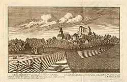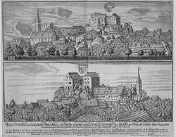 With great prescience prior to the Bavaria-Palatine succession conflict, Puotha of Riesenberg, the most senior state judge (Landrichter) in the Kingdom of Bohemia, enfeoffed the castle in June 1503 on orders from King Vladislaus II for 3,600 Rhenish guilders to Fritz of Seckendorff.[18][19] At the same time, he entered into negotiations with the Imperial City of Nuremberg, which was interested in acquiring Hiltpoltstein in order to rationalise its territory. Unlike Palatinate villages such as Hersbruck, Lauf and Altdorf, which were conquered by or surrendered to Nuremberg during the imminent War of the Succession of Landshut, Hiltpoltstein had to be acquired by Pfandbrief, a deed of fief. This was issued on St. Gall's Day in 1503 at Raudnitz, its price amounted to 6,000 Rhenish guilders.[20] The castle became the seat of a Nuremberg pfleger, but remained formally under Bohemian sovereignty, including the right of access by the King of Bohemia and the possible redemption of the Pfandbrief at any time.[21] The imperial city was interested in this strategically important office despite its freely revocable possession: on St. Vitus' Day in 1509 King Vladislaus of Bohemia and Hungary raised the value of the Pfandbriefe by a further 2,000 florins, since Nuremberg had invested this sum in the expansion of the castle site. The Pflegeramt was established in 1513 and the pflegers, appointed by Nuremberg and resident in the castle, sent annual reports back to the imperial city. In the period 1530–1531, there are reports of repairs being carried out. However, there is disagreement about whether and to what extent the castle was damaged during the Second Margrave War. On 21 May 1552, the castle was captured by the margravial field commander (Kriegshauptmann), William of Stein and, four weeks later, retaken by troops of the imperial city under Martin Schrimpf. The castle was probably ravaged by fire in May or June 1553 and this may well have been part of the numerous attacks on castles by peasants in the area around Nuremberg during this period. Official bills indicate that the castle was not being used again until the 1560s. During excavations of rubble at the end of the 1960s by the then castle owner, Josef Weber, a layer of burnt material was discovered that has been associated with the Second Margrave War.[22] The documentation, however, does not meet archaeological standards; for example, no 14C dating was done. Other authors doubt these attacks on the castle during the peasant unrest and date the burning to the time of the margravial war.[23] In 1560 a treaty was signed between Emperor Ferdinand I, who was also King of Bohemia, and the Nuremberg City Council, that extended the enfeoffment of the castle estate to the imperial city for a further 25 years in return for a payment of 1,500 talers.[24] In 1624, Emperor Ferdinand II devolved Nuremberg's Hiltpoltstein fief to Bohemia.[25]