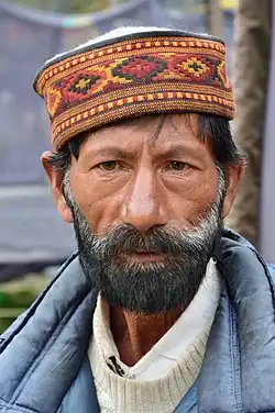 Himachali cap (Bushehri topi, Pahari topi, Kinnauri topi) is a distinctive headdress associated with Himachal Pradesh's culture. It is a part of the traditional dress of many Pahari inhabitants.[1][2][3][4]