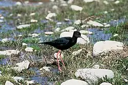 Black stilts are a medium-sized (220 g) wader with extremely long pink legs, red eyes, distinctively black plumage, and a long slender black bill. Juveniles have a white breast, neck and head, with a black patch around the eyes, and black belly feathers that distinguish them from pied stilts.[3] Black adult plumage appears in their first or second year. Black plumage may be an adaptation to "absorb heat better in the cold, windswept habitat of glacial riverbeds and lakeshores".[4]