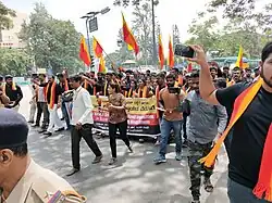 Modern Hindi imposition has been used as a political tool, with many supporting the use of Hindi as a sole language of India with various arguments, while others oppose this action.[7] The term One Nation, One Language has repeatedly been used to justify the imposition of Hindi.[8] Hindu nationalists have used the phrase "Hindi-Hindu-Hindustan",[9][10][11] and are in favour of imposing a Sanskritised Hindi.[12][13][11]