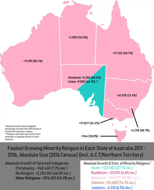 - ^ "Census reveals Australia's religious diversity on World Religion Day". Australian Bureau of Statistics. 18 January 2018. Retrieved 5 August 2021.