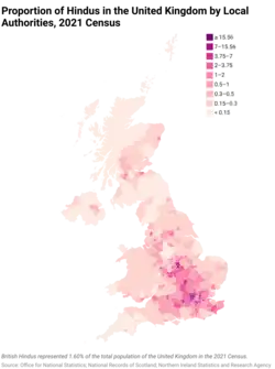 According to the 2021 Census, Hindus in England and Wales enumerated 1,032,775, or 1.7% of the population.[68] Northern Ireland recorded a population of 4,190, or 0.2% of the population.[55] The equivalent census was recorded a year later in Scotland with a population of 29,929, making up 0.6% of the population.[56] The local authorities with the highest number of Hindus were: Harrow (67,392: 25.8% of the population), Leicester (65,821: 17.9%), Brent (52,876: 15.6%), Redbridge (34,372: 11.1%) and Hillingdon (33,020: 10.8%).[69]