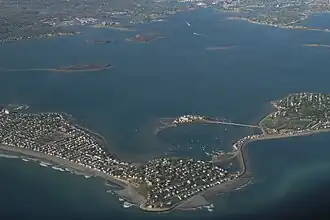The bay is roughly 3 miles (4.8 km) wide east to west and 4 miles (6.4 km) long south to north.[3] It is nearly enclosed on all sides, surrounded by peninsulas, former islands joined to the mainland, and Peddocks Island. There are two passages to Nantasket Roads and the Atlantic Ocean, one a 1,300-foot (400 m) opening at Hull Gut between Peddocks Island and Windmill Point in the northwest and a 0.5-mile (0.80 km) passage at West Gut between the island and Hough's Neck at Nut Island, part of the city of Quincy. Along the western portion of Hingham Bay a 300-foot (91 m) wide, 35-foot (11 m) deep channel allows oceangoing ships access from Hull Gut to Weymouth Fore River.[4] To the north and east the bay is bordered by the town of Hull, where the contiguous water reaching the Hull shore is also known as Hull Bay.[5] On the south, moving west, Hingham Bay is fed by three estuaries: Weir River between Hull and Hingham, Weymouth Back River between Hingham and Weymouth, and Weymouth Fore River between Weymouth and Quincy.[3]