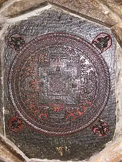 Immediately after passing the door and looking up, one sees a Kalachakra mandala on the ceiling of the entry gate.[8] Stepping further inside one enters an open corridor, with a disused tutedhara (drinking fountain) built into the wall on the left.[4]