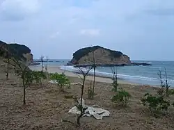 The Hirota Site was discovered in 1955, when human bones and shell products were found in a sand dune facing the Pacific Ocean that collapsed due to a typhoon. Archaeological excavations were carried out two years later, and it was discovered that the ruins date from the late Yayoi period to the late Kofun period. The initial investigation covered an area of approximately 230 square meters, finding human remains from 157 bodies in 90 places, including earthen pit graves, stone graves, and graves where multiple human bones were reburied in groups, including joint burials. As many as 44,000 pieces of shellfish products were buried as grave goods, and this huge collection of shellfish products included "shellfish notes" in which small shell plates were inscribed unique patterns. The materials used include Sinustrombus latissimus, and Conidae, and other shells not native to the area, but which were imported from the southern seas.[2]