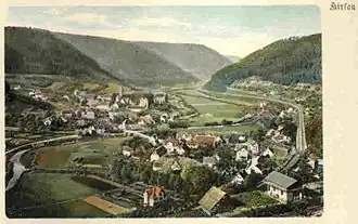 Hirsau's economy includes small retail establishments, tourism, and light industry. There is a saw mill on the Ernstmuhlerweg, the road that runs along the railroad in the post card pasted above. The saw mill is a long building at the upper edge (in the picture) of town.