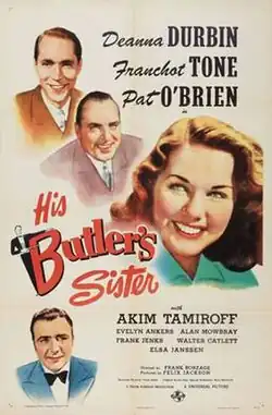 His Butler's Sister is a 1943 American romantic comedy film directed by Frank Borzage and starring Deanna Durbin.[3] The supporting cast includes Franchot Tone, Pat O'Brien, Akim Tamiroff, Evelyn Ankers and Hans Conried.[4] The film was nominated for an Oscar for Best Sound Recording (Bernard B. Brown).[5]