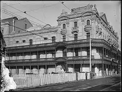 Original proprietor Thomas Molloy leased the theatre to others, including Ben and John Fuller, and local producer Anita Fitzgerald.[22] Another lessee of the theatre, J. C. Williamson Ltd,[22] is said to have made His Majesty's Theatre the Perth home of musical theatre.[18] The theatre was renovated in 1912 at a cost of £A 9,000, and again in 1948 at a cost of £A 11,000.[23] The latter renovation included new backstage electrical fittings and may also have been the time the verandah balconies were removed from the street frontage of the theatre.[23] In 1952, the theatre was leased by the Edgley family[22] and used for "Russian spectaculars".[6] The theatre was redecorated for Edgley and Dawe in 1960, this time at a cost of £A 7,000.[24] Edgley went on to purchase His Majesty's in 1969.[22] After the Perth Entertainment Centre was completed in 1974, the Edgley productions shifted there,[6] and the newly completed Perth Concert Hall was also favoured as a performance venue due to outdated equipment and general disrepair at His Majesty's.[2] The theatre was sold in 1976 to Sir Norman Rydge.[22]