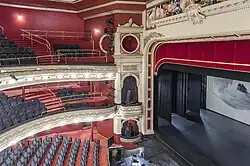 The auditorium contained a proscenium arch,[16] with a raked stage 20 by 23 metres (66 by 75 ft) in size.[17] The auditorium measured 23 by 21 metres (75 by 69 ft),[17] and its original capacity was 2584 people in three tiers.[2] The interior of the theatre was a typical Edwardian horseshoe-shape to bring the audience closer to the performers.[2][17] It featured stalls (seating 974), a dress circle (seating 540), an upper gallery (seating 1,074) and private boxes.[2][5]