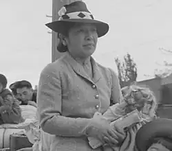 In 1942, over 100,000 Japanese Americans underwent mandatory displacement of life, vocation, and recreation through the Executive Order 9066.[11] With forced removal imminent, Hibi and her husband donated their paintings to different venues in the Hayward community, to express their thanks because they couldn't bring the work with them to internment camps for the duration of World War II.[12] The Hibi family was first moved to the Tanforan Assembly Center in May and then to a more permanent camp at Topaz, Utah in September. Photographer and friend to the Hibi family, Dorothea Lange took a snapshot on May 8, 1942 of Hibi and her daughter Ibuki as they stood next to what was left of their belongings. In this photo, Ibuki Hibi, five years old, and her mother, Hisako Hibi, hold onto dolls [13] as they await the internment busses that transport them to the Tanforan Assembly Center.[14]