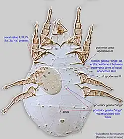 Both females and males of Histiostoma have two pairs of genital rings. In females, the anterior pair are positioned laterally between the bases of the second and third leg pairs, while the posterior pair are not associated with the anus. Additionally, in both sexes the pretarsi have ambulacra that are not bilobed. The chelicerae are modified and brush-like.[3]