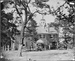 No precise descriptions of the interior of the courthouse have surfaced, but it was customary for a large table to be centered in the main chamber of the courthouse. This table was usually spacious enough to seat the sheriff and justices of the county court, and it is likely that the courthouse followed this same layout. It was also customary to separate the portion of the court occupied by the public, which was done by the installation of a wooden railing or a partition. Fireplaces likely heated the courtroom chamber and the second floor jury room.[7] The new courthouse complex gradually became the center of activity for the county, and in 1805 the area around the new structure became known as the Town of Providence. The location of the new courthouse was ideal, being located at the junction of Little River Turnpike and Ox Road (present day routes 236 and 123) and providing easy access to most parts of the county.[8]