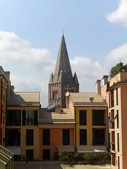 Prior to the construction of the city walls in the 12th century (known as the Barbarossa walls, with a perimeter four times as large as the previous ones),[73] three zones were distinguished in the city: the castrum, i.e., the area of the initial settlement around Sarzano; the ripa area, where traffic and activities related to the port took place; and finally the burgus, outside the walls, where the first cathedral was located, the church of San Siro, which still exists today, although it has been partially destroyed and rebuilt several times.[74] The construction of the walls, in addition to incorporating the peripheral area of the church of San Siro into the city, also included the area (closer to the previous circle of walls) of the Basilica of Santa Maria delle Vigne, which had risen about three centuries earlier in an area called Vigne del Re,[75] a name that would attest to the probable presence of vineyards immediately outside the previous city center. The cultivation of vineyards and the presence of some chestnut groves, would also be confirmed by a document from 886, which describes the area as owned by the monks of St. Peter's Church, the clergymen of St. Syrus Cathedral and the family of the viscount (vicecomes) Ydo.[76]