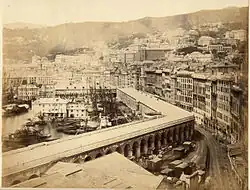 There were several streams and creeks in the area, which over the centuries were covered and/or channeled into the city sewer system to obtain new building areas. Some terms in the city's toponymy refer to these streams, for example in the street at the Ponte Reale (connecting Piazza Banchi to Piazza Caricamento), where the term "Reale" would not mean royalty, but would be a deformation of rià (rio, or stream, in Genoese), from the riale di Soziglia (i.e., Soziglia stream) that flowed in the area.[6] Another example would be Piazza Acquaverde (opposite the Piazza Principe train station), whose name is said to derive from the presence of a pond rich in algae, hence the greenish color, fed by the Sant'Ugo stream (a legend has it that it was the saint himself who caused the water that fed the pond to gush out).[7]