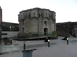 The town's barracks occupies a large area of the west bank of the River Shannon. Athlone Barracks, named Victoria Barracks in 1837, was re-named Custume Barracks in 1922 by General Sean MacEoin, independence fighter and first GOC Western Command.[4] It is named after a Sergeant Custume who, during the 1691 Siege of Athlone, led a dozen volunteers (of whom 2 survived) out under the Dutch guns to tear down a wooden bridge. The barracks was the headquarters of the Western Command of the Irish Defence Forces until a reorganisation in 2013. It remains the headquarters of several infantry, artillery and engineering regiments of the defence forces.[5] The original entrance to the barracks was where the current Garda station is today.