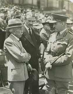 Defence issues became increasingly prominent in public affairs with the rise of fascism in Europe and militant Japan in Asia.[101] Prime Minister Lyons sent veteran World War I Prime Minister Billy Hughes to represent Australia at the 1932 League of Nations Assembly in Geneva and in 1934 Hughes became Minister for Health and Repatriation. Later Lyons appointed him Minister for External Affairs, however Hughes was forced to resign in 1935 after his book Australia and the War Today exposed a lack of preparation in Australia for what Hughes correctly supposed to be a coming war. Soon after, the Lyons government tripled the defence budget.[102] With Western Powers developing a policy of appeasement to try to satisfy the demands of Europe's new dictators without war, Prime Minister Lyons sailed for Britain in 1937 for the coronation of King George VI and Queen Elizabeth, en route conducting a diplomatic mission to Italy on behalf of the British Government, visiting Benito Mussolini with assurances of British friendship.[102]