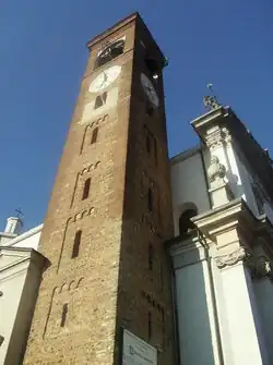 The oldest building still standing in the town is the base of the bell tower of the church of St. Michael the Archangel, dating back to the 9th or 10th century.[27] The dedication of the church to St. Michael the Archangel, whose cult was particularly widespread among the Lombards, has led to the assumption of an original settlement of that population near the church, which in its present phase must have replaced an older, smaller building of worship. The presence of a fortification is consistent with the location of the site, which is at the highest point of the ancient municipal territory, and with the appellation of borgo, assumed in medieval times by the ancient locus Busti.