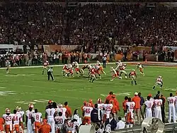 From 1987 to 1990, Clemson posted four consecutive 10 win seasons and won three straight ACC titles, including a 35–10 victory over Penn State and a 13–6 defeat of Oklahoma in the 1989 Florida Citrus Bowl. At that time, no team in Clemson history started higher in the AP poll than the 1988 team beginning the year as the No. 4-ranked team in the nation and a preseason favorite to win the national title. Five years after their first probation under Ford ended, Clemson once again found their football program accused of multiple recruiting violations in January 1990.[35] The NCAA accused Clemson coaches of committing 14 rules violations, including giving cash to players and having illegal contact with recruits over a period from 1984 to 1988.[36] Shortly after, Ford submitted a forced resignation. The NCAA later cleared Clemson of all allegations.[37][36] Ford coached 21 All-Americans and 41 players who went on to play in the NFL, during his 11 seasons at Clemson. After a few years away from coaching, Ford was hired by Arkansas in 1992, where he would spend five seasons guiding the Razorbacks. In 2017, Ford was named to the College Football Hall of Fame.[38]