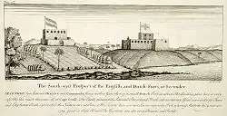 The Portuguese position on the Gold Coast remained secure for over a century. During that time, Lisbon sought to monopolize all trade in the region in royal hands, through appointed officials at São Jorge, and used force to prevent English, French, and Flemish efforts to trade on the coast.[48] By 1598, the Dutch began trading on the Gold Coast.[49] The Dutch built forts at Komenda and Kormantsi by 1612. In 1637 they captured Elmina Castle from the Portuguese and Axim in 1642 (Fort St Anthony). Other European traders joined in by the mid-17th century, largely English, Danes, and Swedes.[50] The coastline was dotted by more than 30 forts and castles built by Dutch, British, and Danish merchants primarily to protect their interests from other Europeans and pirates. The Gold Coast became the highest concentration of European military architecture outside of Europe. Sometimes they were also drawn into conflicts with local inhabitants as Europeans developed commercial alliances with local political authorities.[51] These alliances, often complicated, involved both Europeans attempting to enlist or persuade their closest allies to attack rival European ports and their African allies, or conversely, various African powers seeking to recruit Europeans as mercenaries in their inter-state wars, or as diplomats to resolve conflicts.[42][52][53]