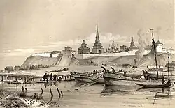 As a result of the Siege of Kazan (1552) Russia under Ivan the Terrible conquered the city for good, the majority of the population was massacred.[4][5] From During the governorship of Alexander Gorbatyi-Shuisky, most of the khanates's Tatar residents were killed or forcibly Christianized. Mosques and palaces were ruined. The surviving Tatar population was moved to a place 50 kilometres (31 mi) away from the city and this place was forcibly settled by Russian farmers and soldiers.[5] Tatars in the Russian service were settled in the Tatar Bistäse settlement near the city's wall. Later Tatar merchants and handicraft masters also settled there. During this period, Kazan was largely destroyed as a result of several great fires. After one of them in 1579, the icon Our Lady of Kazan was discovered in the city. In the early 17th century, at the beginning of the Time of Troubles in Russia, the Kazan Khanate declared independence with the help of the Russian population, but this independence was suppressed by Kuzma Minin in 1612.