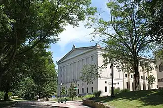 With the opening of the Kent Free Library in 1892, Kent became the first municipality in Ohio to take advantage of a new state law which allowed municipalities with populations under 5,000 to tax residents for the upkeep of a library.[27] In 1903, the library moved to its current location on West Main Street in a building that was financed by a $10,000 USD ($377,960 present-day) gift from Andrew Carnegie. Carnegie donated the money on the condition residents provided a site and $1,000 USD ($37,796 present-day) per year for maintenance. The levy passed overwhelmingly[28] on September 17, 1901 and the site was donated by Marvin Kent. Although additions have been made throughout the years, the original library building still stands today and currently houses the library's genealogy and local history areas. Most recently, all previous additions were demolished and a new, three-story addition was constructed which tripled the previous amount of available space. This new addition opened on September 26, 2006, exactly 103 years after the original library opened.[29]