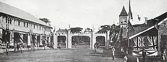 European sources in the late 19th century mentioned the city's neatness such as the account of F. Boyle in 1874 who stated Kumasi's smell "are never those of sewage" as well as Brackenbury, who wrote around 1873 that "the streets are generally very broad and clean, and ornamented with many beautiful banyan-trees affording grateful shade from the powerful rays of the sun."[16] In contrast, William Butler described the city amid the British invasion, as 'a filthier, and far more blood-stained collection of mud and wattle hovels than any other village in the forest.'[25] Parts of the city, including the then royal residence, were burnt by the British in the Third Anglo-Ashanti War of 1874.[26] Native carriers were generally blamed for torching the city, and British engineers made strenuous efforts to quell the fires.[25]