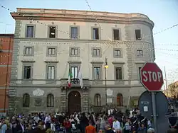 In 1564 the seal of the Marinese community appeared for the first time, depicting a knight carrying a banner (which basically remained unchanged over the centuries);[62][63] in 1566 the new "Statutes" were issued,[51] and in 1572 the "Bandi, provisioni et ordinationi" on gambling, blasphemy and brawling:[62] both documents were lost as a result of the Anglo-American bombings that devastated the municipal archives during World War II;[64] also in 1566, the construction of Palazzo Colonna was one-quarter complete, including the peperino entrance staircase,[62] and the new thoroughfare of Via Roma was fully inhabited.[62]