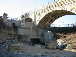 The fix was a concrete dike (wall) built by the Corps of Engineers just upstream from the falls all the way across the river from just under the limestone cap down as much as 40 feet (12 m). Progression of the falls upstream was a separate problem, and was stopped by the Corps finishing a wooden apron (later replaced by concrete) creating a spillway to protect the edge of the falls and underlying sandstone. The Corps also built low dams above the falls to keep the limestone wet, as drying increased weathering.[17] This work assisted by the Corps was eventually completed in 1884. The federal government spent $615,000 on this effort, while the two cities spent $334,500.[14] Possibly as a result of the bonding needed to rehabilitate the falls, the cities of St. Anthony and Minneapolis merged on April 9, 1872.[6]