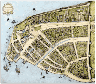 The early Dutch city of Nieuw Amsterdam (New Amsterdam) took full advantage of the rivers which surrounded the city, foreshadowing the empire that New York's shipping industry would establish two centuries later. According to the Castello Plan, multiple canals and waterways were built, including a very early canal on the present-day Broad Street, which was called the Heere Gracht. According to Burrows, et al.,[1] a municipal pier was built on what is now Moore Street, on the East River. The first regional ground transportation that was built out of Nieuw Amsterdam was a "wagon-road" that linked to Nieuw Haarlem (Harlem). It was built in 1658 to encourage development of that town, by order of Petrus Stuyvesant, who saw that Nieuw Haarlem could provide an important measure of defense for Nieuw Amsterdam.